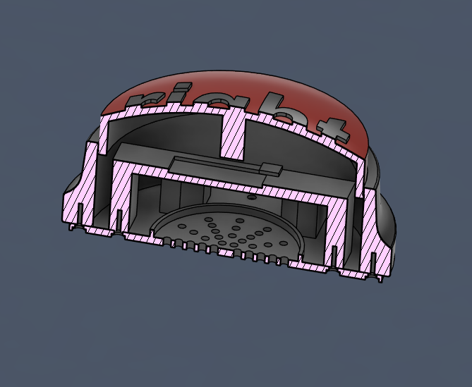 CAD Model of the button, complete with subframe, outer shell, button top, and a base plate with mounting holes for self-taping screws and speaker holes for the sound to travel. The final product had rubber feet to offset it from the ground so that the sound could escape from under the device