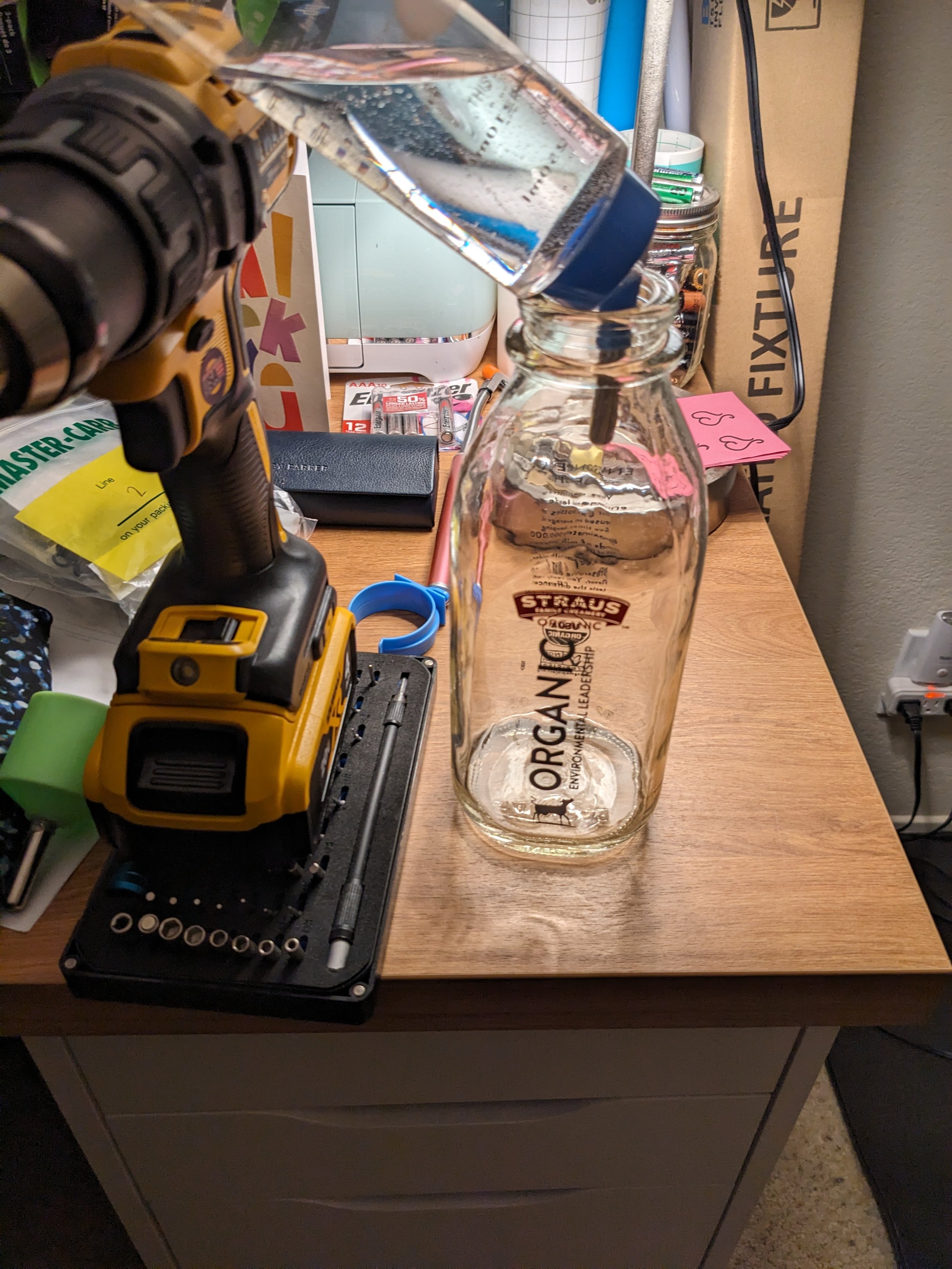 In the final version, we wanted the watering bulb to be staked into the pot, with a removeable reservoir at the top for easy refilling. The CAD above shows the shape and cross section, and the image right was a test to check that our geometry would allow flow as expected.