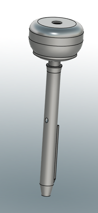 The working electromagnet mechanism shown right, long with a cross section of the CAD on the left. You can see the rounded tip of the reservoir where the steel ball lives, as well as the indentation to locate the wire coil.